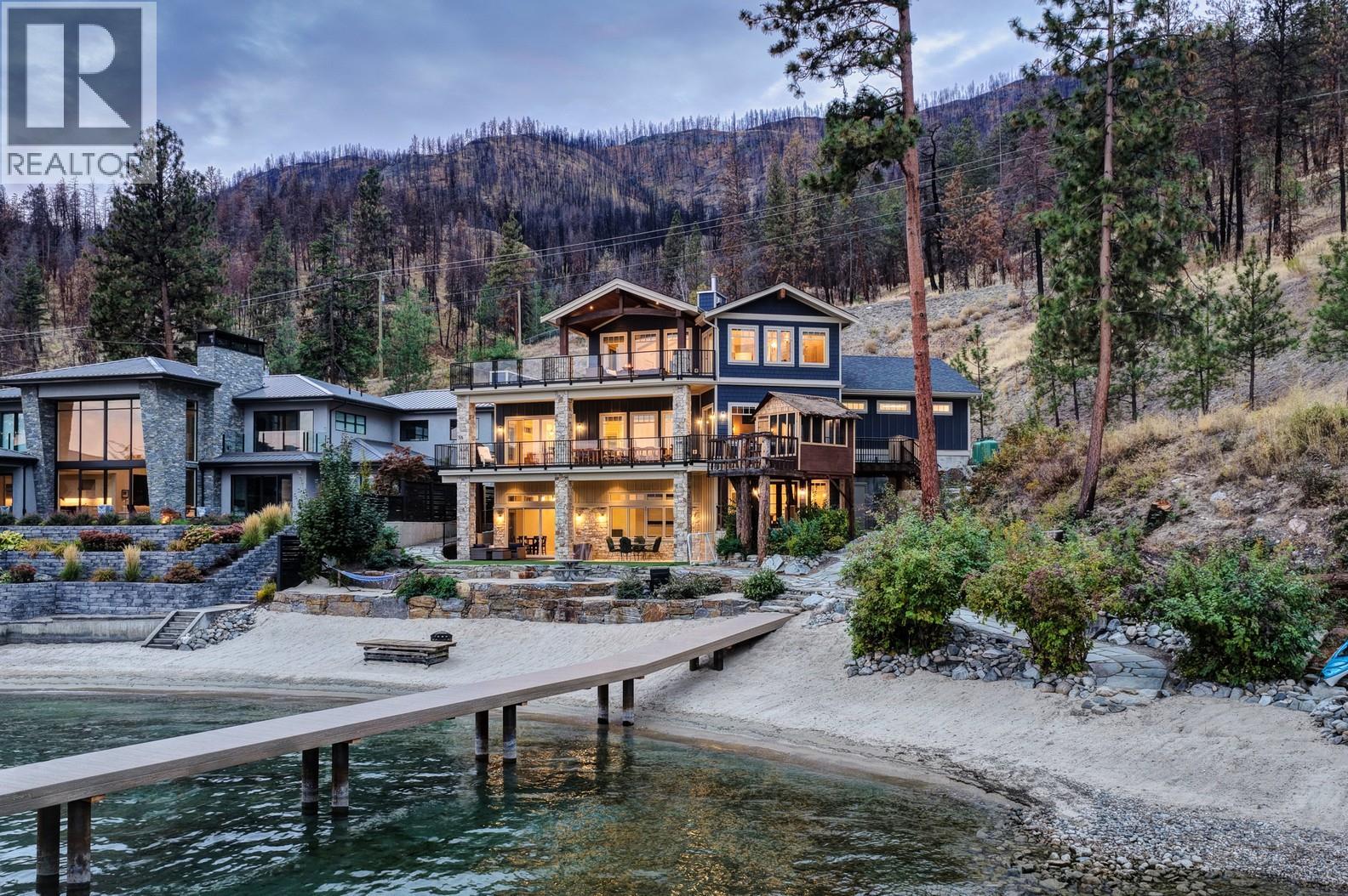Experience one of the Okanagan’s most desirable waterfront settings with a serene, sandy bay, 120 ft. of pristine shoreline and some of the best sand in the valley, both on shore and beneath the water. This exquisite, turn-key home captures the essence of lakeside luxury, offering panoramic views, timeless architecture, and a relaxed sophisticated style throughout. Inside, the open-concept main level showcases soaring vaulted ceilings, exposed beams, and a stunning limestone fireplace that anchors the great room. The gourmet kitchen features granite countertops, a large central island with seating for six, and premium KitchenAid appliances, flowing seamlessly to the dining area and lakeview deck. A secondary primary suite on this level includes a spa-inspired ensuite and walkout access to the covered patio. Upstairs, the primary retreat impresses with vaulted ceilings, a private deck, a freestanding tub framed by lake views, and a spacious walk-in closet. The family room and wet bar extend to a partially covered terrace with a two-person spa — ideal for sunset evenings. The lower level is designed for entertaining, featuring a theatre with leather recliners, a full kitchenette, and walk-out access to multiple tiered patios that lead to the beach, new private dock, and charming treehouse lounge. Complete with solar panels, two-car garage with expoxy finish, and resort-style outdoor spaces, this residence defines refined Okanagan lakefront living. (id:2469)