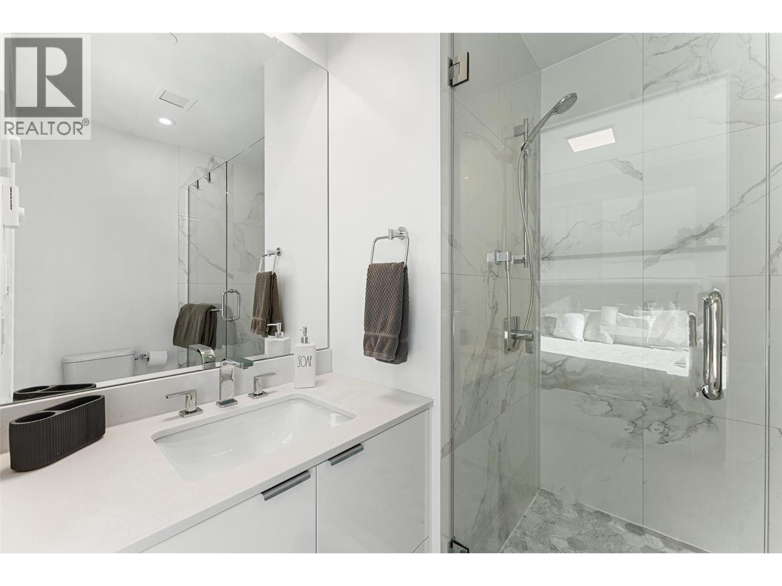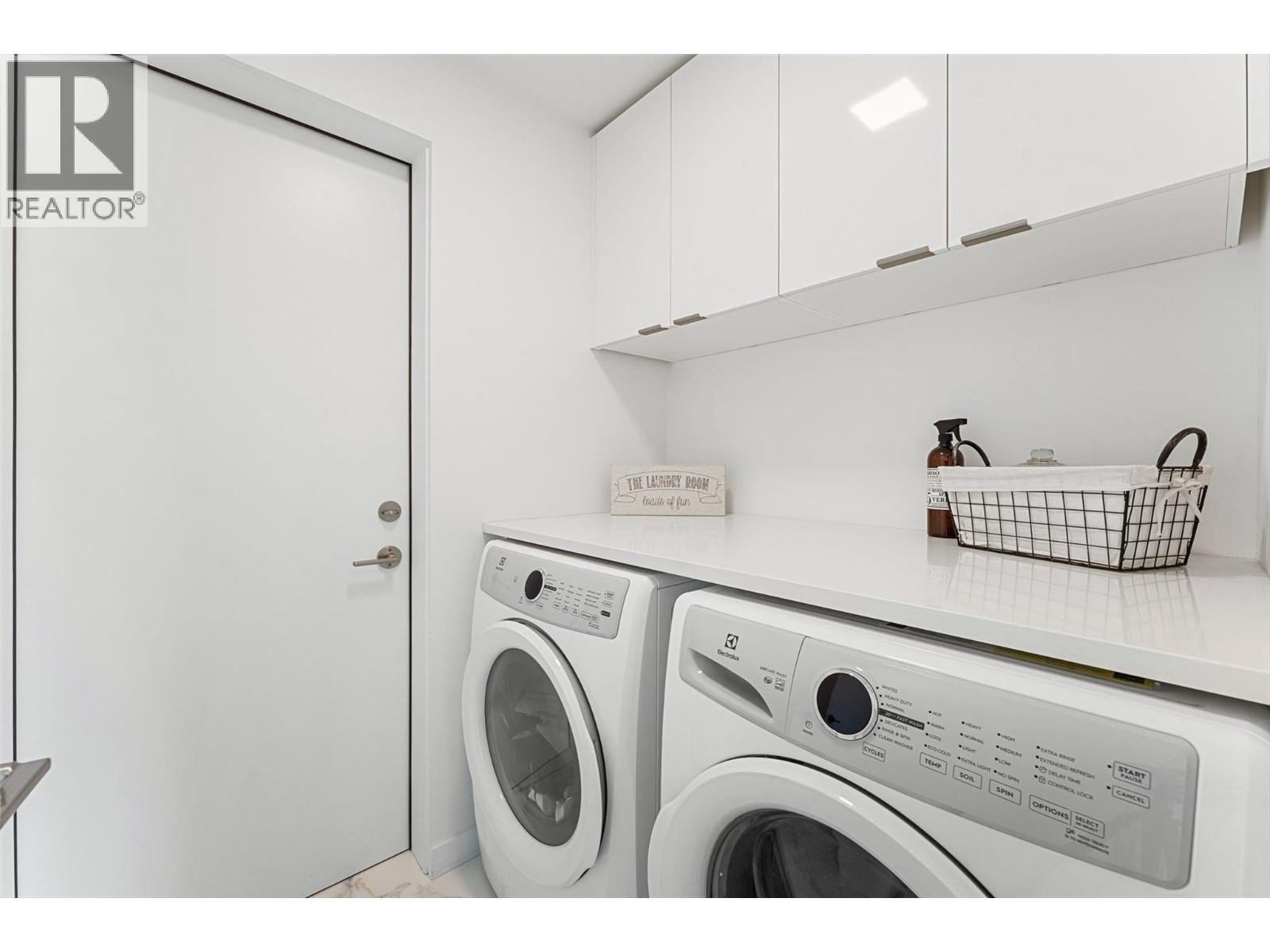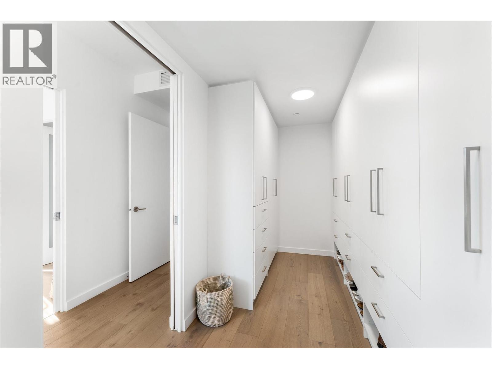 Experience elevated living in this contemporary residence with expansive, breathtaking views of Okanagan Lake and the surrounding mountains. Walls of glass frame the scenery throughout the open-concept main living area, where 10 ft. ceilings, wide-plank hardwood, and aseamless flow creating a bright and inviting space. The kitchen features sleek white soft-close cabinetry, a waterfall edge island, and premium Fisher & Paykel appliances including a six-burner gas range, paneled fridge/freezer, and wine fridge. The living and dining areas open to a covered lakeview patio with glass railings, a gas line for BBQ, and power sunshades—perfect for entertaining or quiet mornings overlooking the sparkling blue waters of Okanagan Lake. The primary retreat features a walk-in closet with custom built-ins, a Juliet balcony, and a spa-inspired ensuite with heated floors, a freestanding tub, and a fully tiled glass shower. Two additional bedrooms, each with their own ensuite, provide comfort and privacy for family or guests. Every detail has been thoughtfully designed, from the power blinds in every room to the direct elevator access and heated double garage with EV charging. Located in a boutique building backing onto a park, and just steps to the shores of Okanagan Lake, this home captures the best of Kelowna’s modern lakeside lifestyle—effortless, refined, and surrounded by nature. (id:2469)