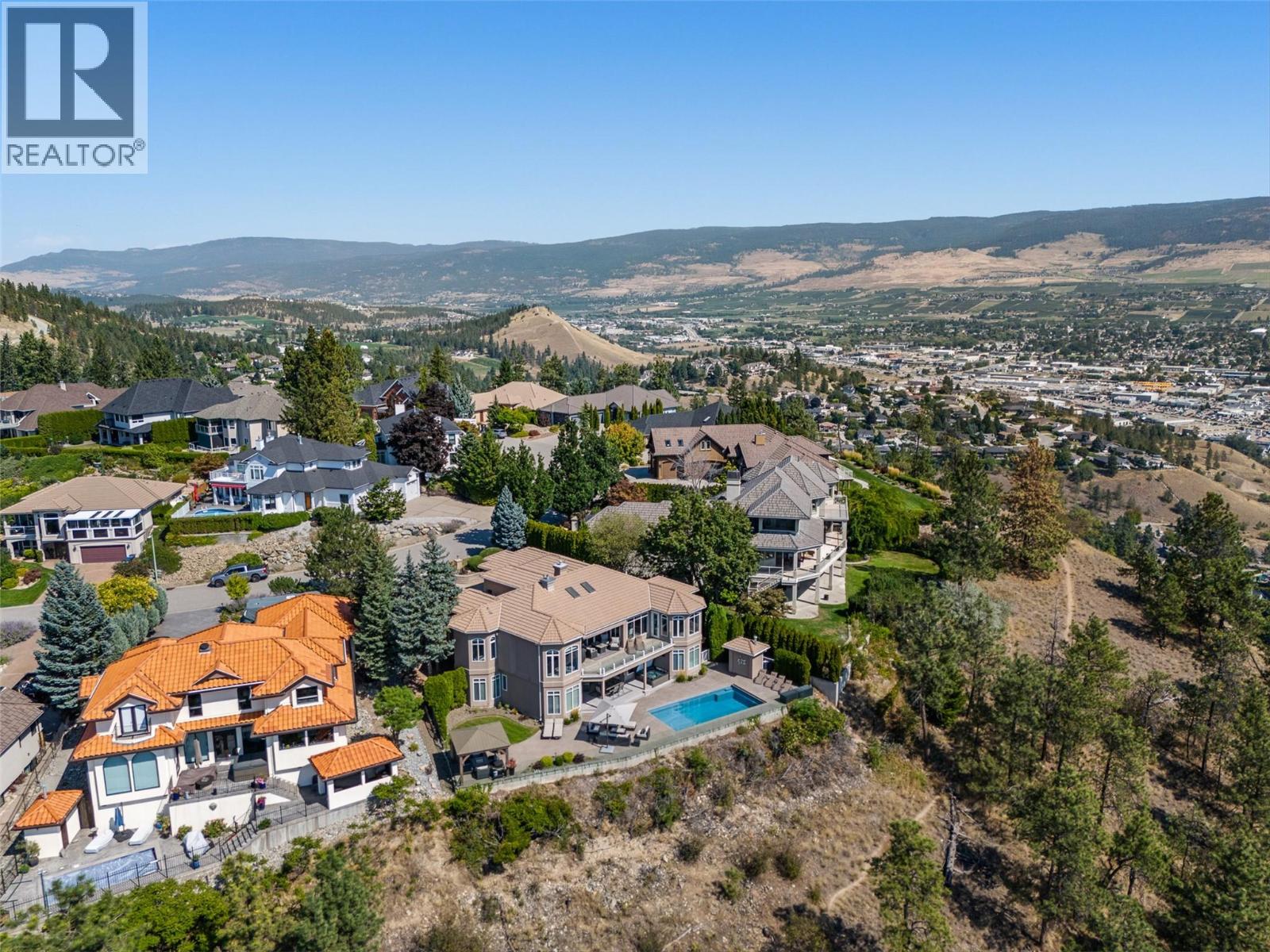 Elevated above the city on one of Kelowna’s most desirable streets, this renovated Dilworth Mountain residence sits on a large, private lot and offers front-row views of Okanagan Lake, the valley, and downtown. Walls of windows, skylights, and soaring ceilings fill the home with natural light, while thoughtful updates blend timeless elegance with modern luxury. The main level is designed for entertaining with an expansive open concept plan. A statement living room with gas linear fireplace connects to the dining area and chef’s kitchen. The kitchen features quartz counters, a striking L-shaped island, professional-grade Thermador appliances, and a hidden servery with wine storage and built-in desk. The primary suite is a retreat of its own—complete with fireplace, walk-in closet, and spa-like ensuite where the freestanding soaker tub captures unobstructed valley views. The lower level is ideal for hosting family and guests with a large rec room and wet bar, media room, gym, den, and four additional bedrooms. Glass doors lead to the backyard oasis where a stunning tiled pool, hot tub, gazebo, and multiple lounging areas create resort-style living at home. The large level driveway offers ample parking which leads to an oversized 3-bay epoxy-finished floor garage, complete with extensive storage space. This property represents a rare opportunity to the best of Kelowna living – panoramic views, exceptional design , and professionally landscaped private grounds , set in an enviable location! (id:2469)