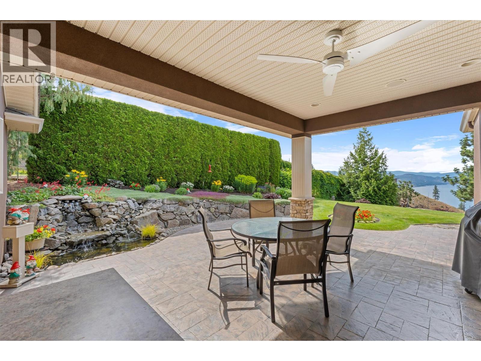 Welcome to The Pointe, an exclusive and tranquil community just north of Lakestone in Okanagan Centre. Capturing breathtaking south-western lake views, this 3,365 Sq.Ft. walkout rancher offers an exceptional blend of serenity, elegance and indoor–outdoor living. Set within a perfectly manicured lot, the property is a true private retreat complete with impressive rock walls, handcrafted staircases and a fully fenced back yard with hot tub, soothing water feature and an expansive covered patio, perfect for relaxing afternoons or sunset gatherings. The main level features a bright open-concept dining and living space with vaulted ceilings, anchored by a gas fireplace framed in stone with a rich wood mantle. Solid oak hardwood floors extend throughout, complementing the chef’s kitchen equipped with granite countertops, gas cooking and an adjacent prep area perfect for hosting with ease. A generous skylit foyer leads to two beautifully appointed bedrooms on this level, including the primary suite. The ensuite showcases a two-way fireplace, soaker tub, heated floors and spacious walk-in closet with direct access to the laundry room. A walkout basement with expansive windows seamlessly connects the interior to the outdoor oasis. A large recreation area with wet bar offers the perfect setting for entertaining, while a sound-proofed media room and temperature-controlled wine storage enhances the home’s sophisticated amenities. An office or additional bedroom provides a welcoming space for guests, complemented by a versatile den ideal for use as a massage or fitness room. Car enthusiasts will value the storage: a 220V double garage, plus a second single garage and workshop with its own driveway, and fully serviced RV site. Meticulously maintained and move-in ready, recent upgrades include a high-efficiency furnace, hot water tank and new roof. Minutes from award-winning wineries, boat launch and public beach, this remarkable property offers an unparalleled Okanagan lifestyle. (id:2469)