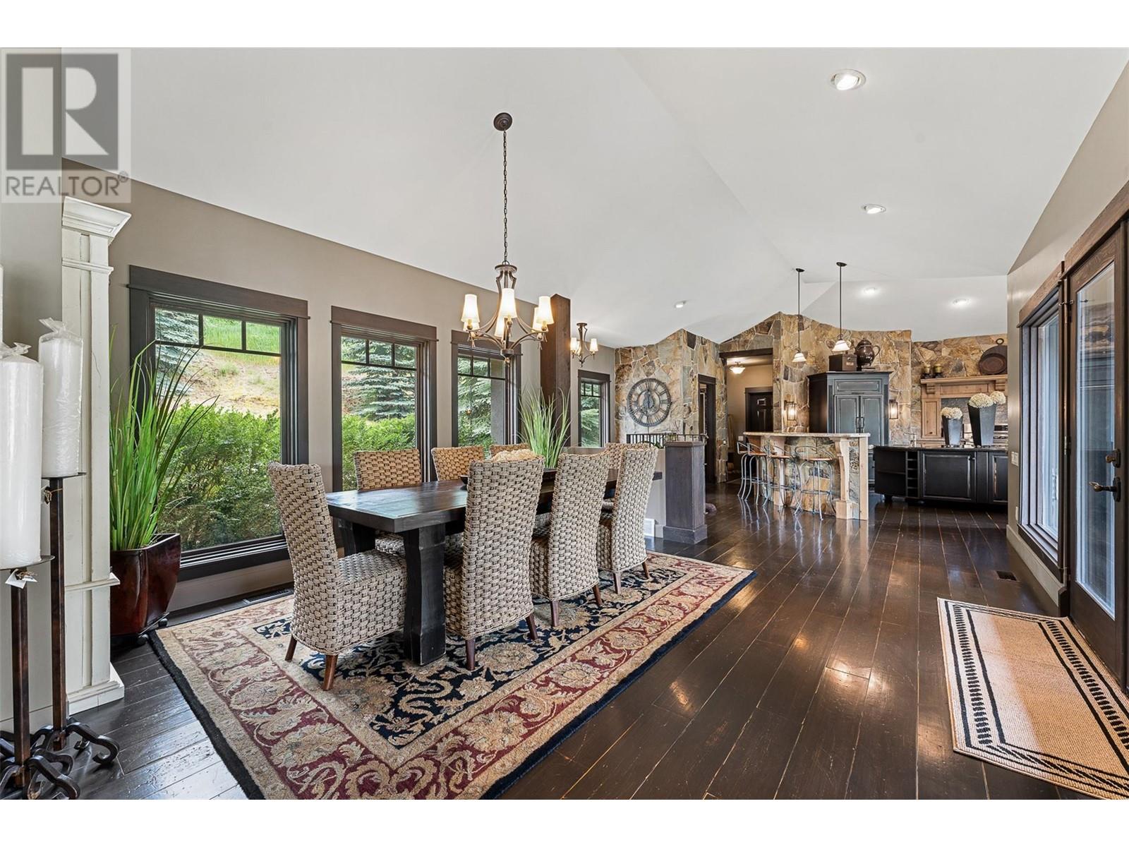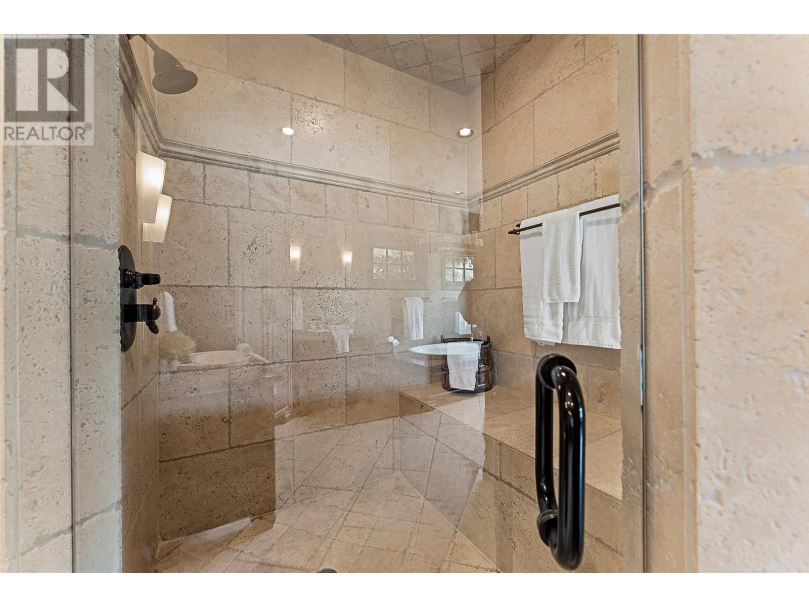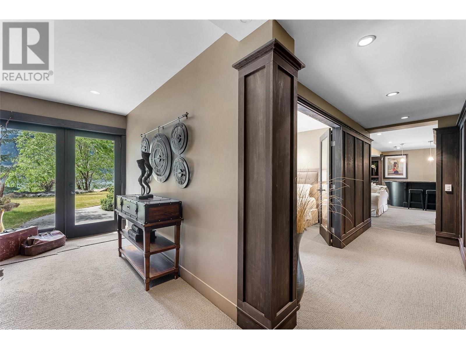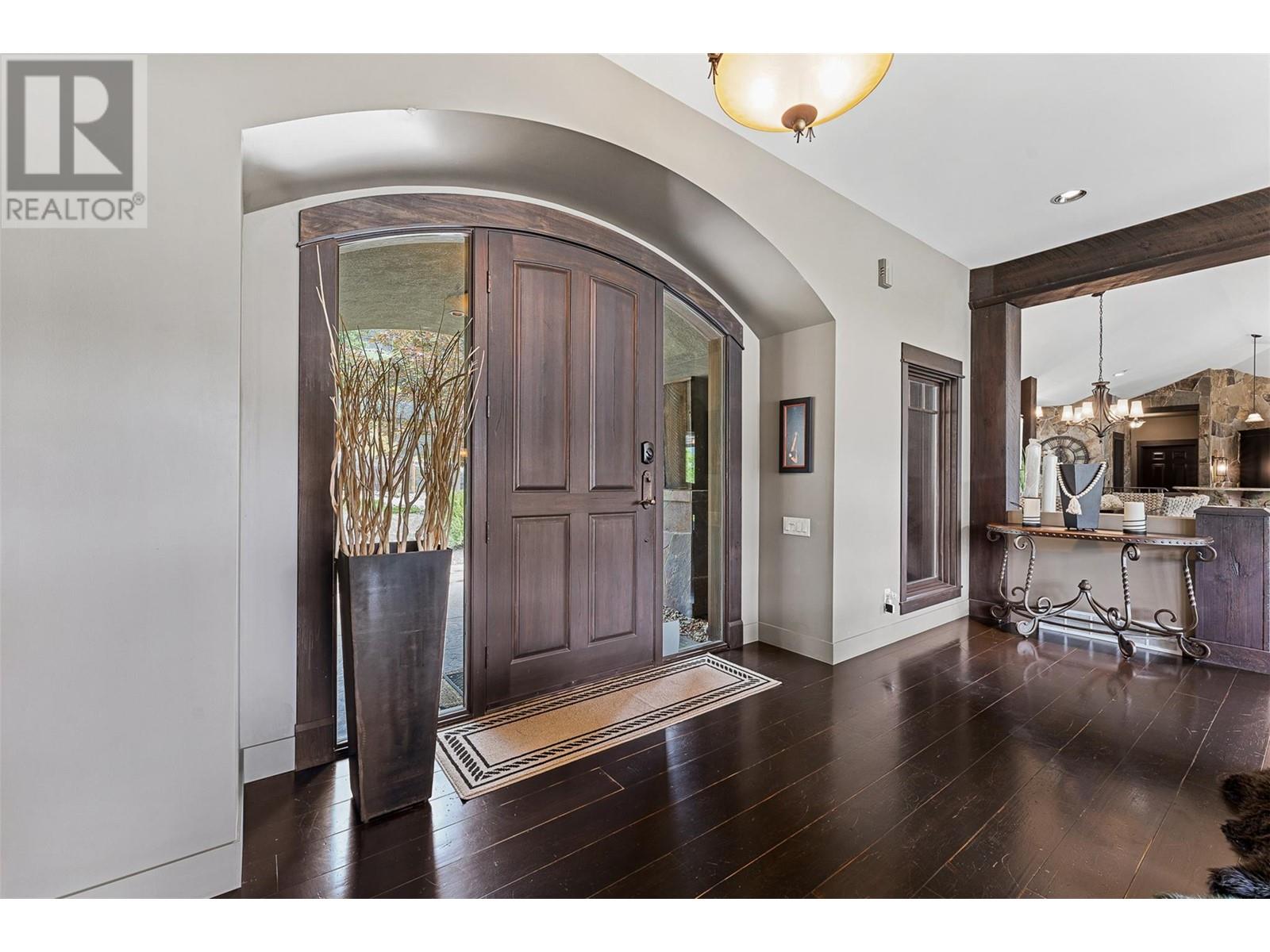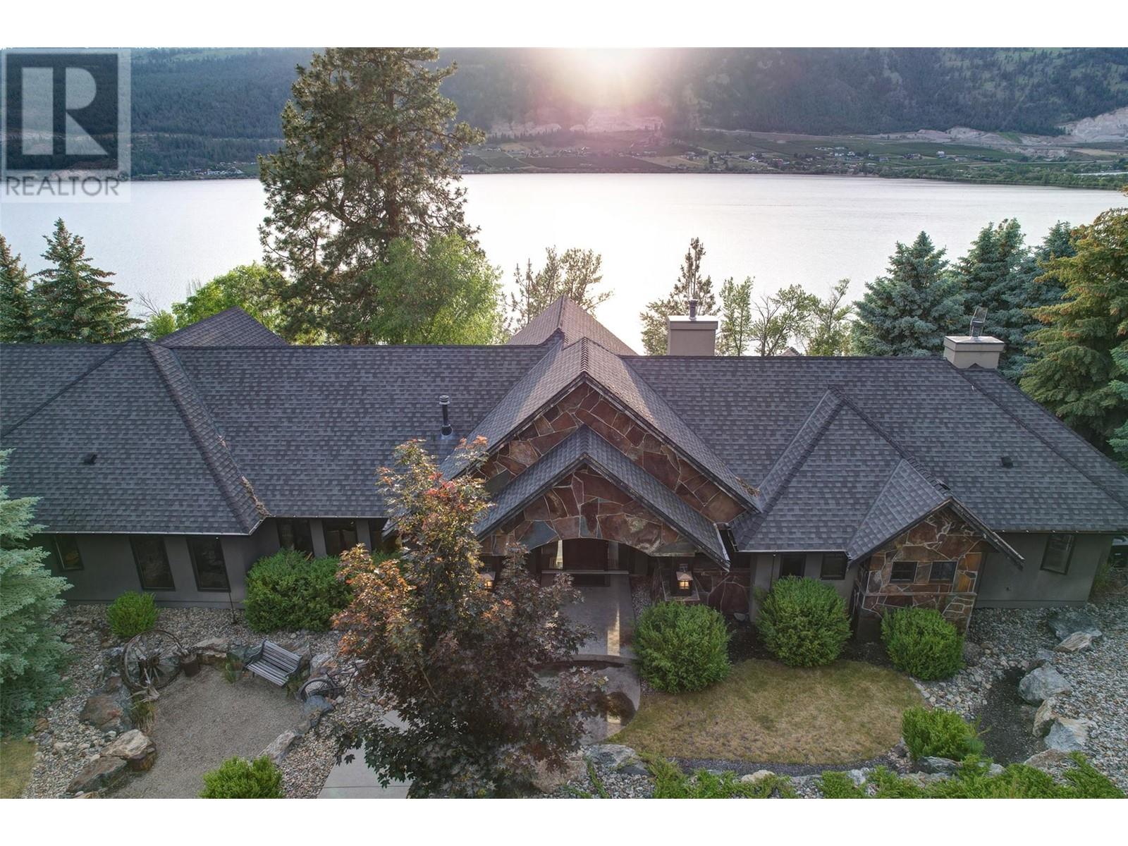 Set on 1.10 acres with panoramic lake views, this 4 bedroom, 4 bath walk-out rancher offers 3,725 sq. ft. of refined living space just steps from the Okanagan Rail Trail, Wood Lake, and Kalamalka Lake. Outdoor living is elevated with a covered upper deck featuring a vaulted ceiling, gas line, and a unique bridge design, plus a partially covered lower patio with dual access. Inside, natural materials and custom craftsmanship shine with vaulted ceilings, pine hardwood floors, floor-to-ceiling windows, and genuine stone details throughout. The chef’s kitchen boasts two islands (one with wine storage, one with seating), granite counters, and a built-in JennAir and Frigidaire appliances. The dining area opens to the deck, while the living room features a stone fireplace and floor to ceiling windows that frame the lake views. The primary suite is a true retreat with a fireplace, spa-inspired ensuite, and access to an outdoor shower. Downstairs offers a cozy recreation room, custom bar, and lakeview guest rooms. Additional highlights: 3-stall garage with granite-topped built-ins, custom entry door, built-in speakers, B&B license, and space for a pool. A rare opportunity for privacy, luxury, and adventure in the heart of the Okanagan. (id:2469)