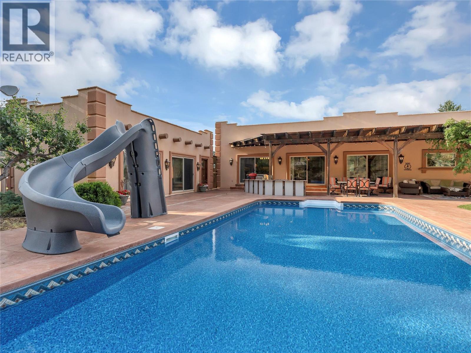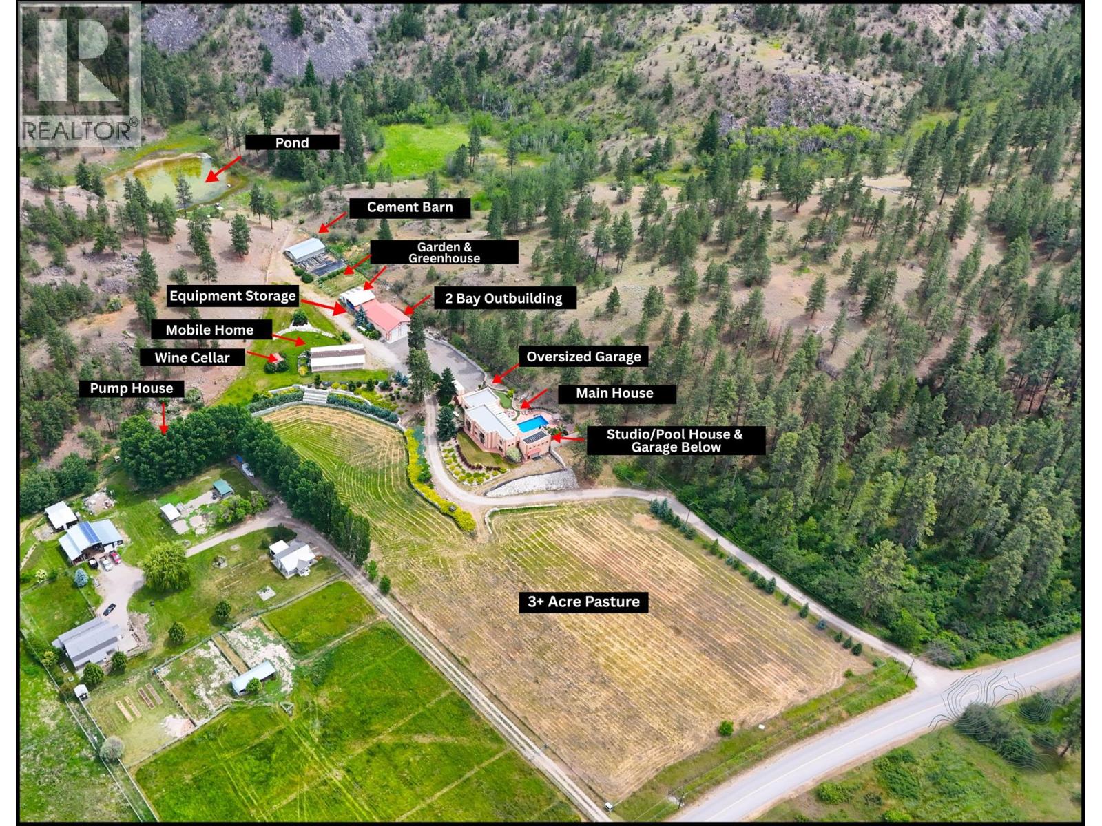Welcome to your private South Okanagan retreat, an extraordinary 10+ acre estate in the heart of wine country. This custom built Santa Fe inspired home with walkout lower level is a one of a kind offering privacy, timeless design, & seamless indoor-outdoor lifestyle. The 3,300 SF 3bdrm, 3bth residence showcases imported Mexican tile, bamboo flooring, & 10' ceilings. The chef’s kitchen features a Bubinga wood island, granite counters, premium appliances, & a walk-in pantry. The main living area centers around a stunning stone fireplace, adding warmth & architectural charm. A spacious primary suite offers a spa ensuite with a clawfoot tub & steam shower. Step outside to your private resort style oasis with an inground saltwater pool, firepit, putting green, & a covered outdoor kitchen. A 32' x 16' Studio/Pool House with Murphy bed, 3pc bth & built-in cabinetry offers flexibility. There is another heated workshop with garage door opening located directly below. The fully fenced acreage inc. a 36' x 50' heated 2 Bay Outbuilding with 16' ceilings, 2pc bth & Sani-dump, multiple outbuildings, equipment sheds, greenhouse, garden & a 14' x 66' 2bd, 2bth mobile home for guests, caretaker, or rental use. Whether you’re seeking a family estate, equestrian retreat, or vineyard vision – bring your ideas! Total sq.ft. calculations are based on the exterior dimensions of the building at each floor level & include all interior walls & must be verified by the buyer if deemed important. (id:2469)