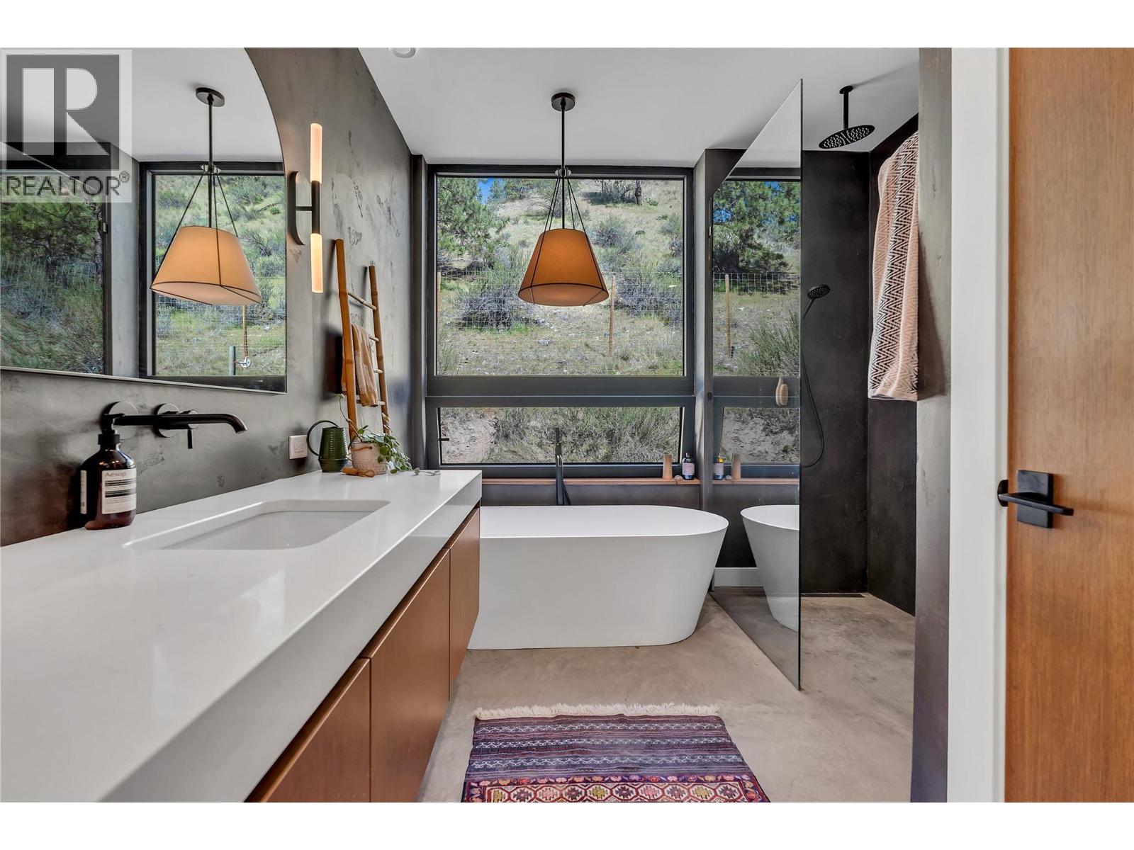 A rare MODERN ESTATE on 10.79 acres in Willowbrook—central South Okanagan. Offering architectural design, income flexibility & stunning mountain-to-valley views. Completed with exceptional attention to detail, this two-structure modern residence spans approx. 1,700 sqft in the main home plus an 800+ sqft 2-bed secondary suite, joined by a covered breezeway for seamless indoor/outdoor living. Inside the main home the soaring 12 ft ceilings, polished concrete floors & floor-to-ceiling glass create an elevated yet relaxed atmosphere. The Downsview custom kitchen features Wolf and Bosch appliances, a chef’s pantry & oversized island. The living space is anchored by a concrete-board fireplace surround and expansive windows capturing sunrise & sunset views. The primary suite includes a spa-inspired ensuite with porcelain tub & walk-in closet. The carriage house offers its own private entrance, galley kitchen, laundry, 2 bed/1 bath—ideal for multi-gen living or revenue ($25–30K/yr as a high-demand short-term rental). The property offers approx. 4 usable acres, light fencing, and room for animals. It includes a detached garage, workshop with bathroom and laundry, yoga shed and mod pool. Located in a quiet setting surrounded by protected grasslands yet only minutes to Oliver, recreation, wineries, and a scenic drive to Penticton. Enjoy daily hikes to the top of the property and take in spectacular lake & valley views. THIS IS an EXTRA ORDINARY blend of design, privacy & versatility! (id:2469)