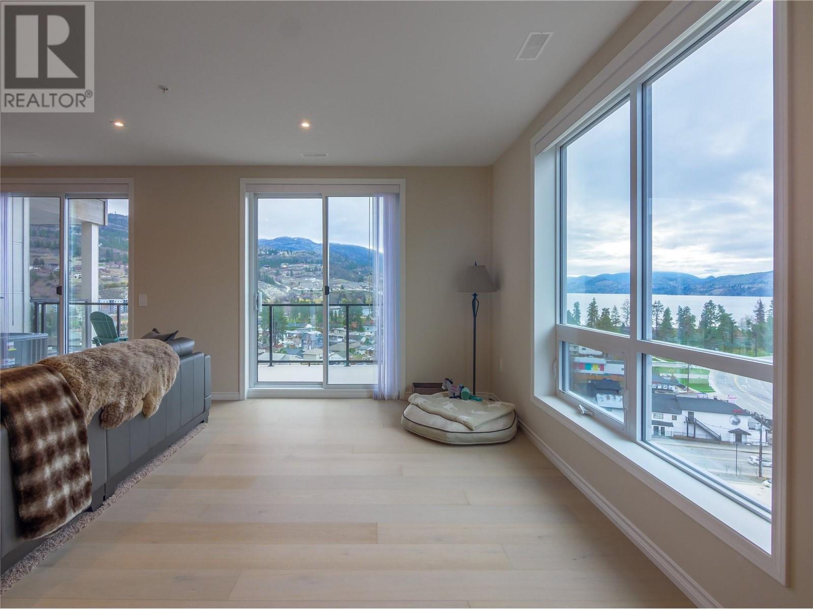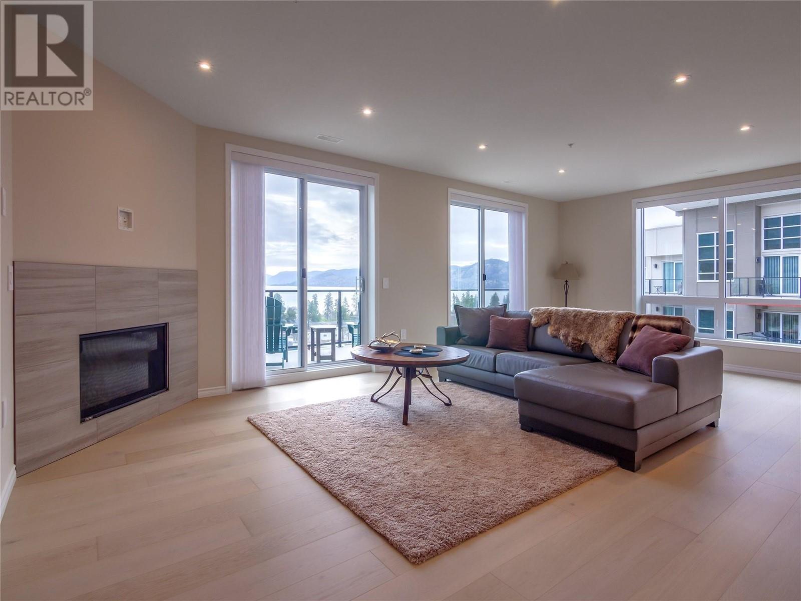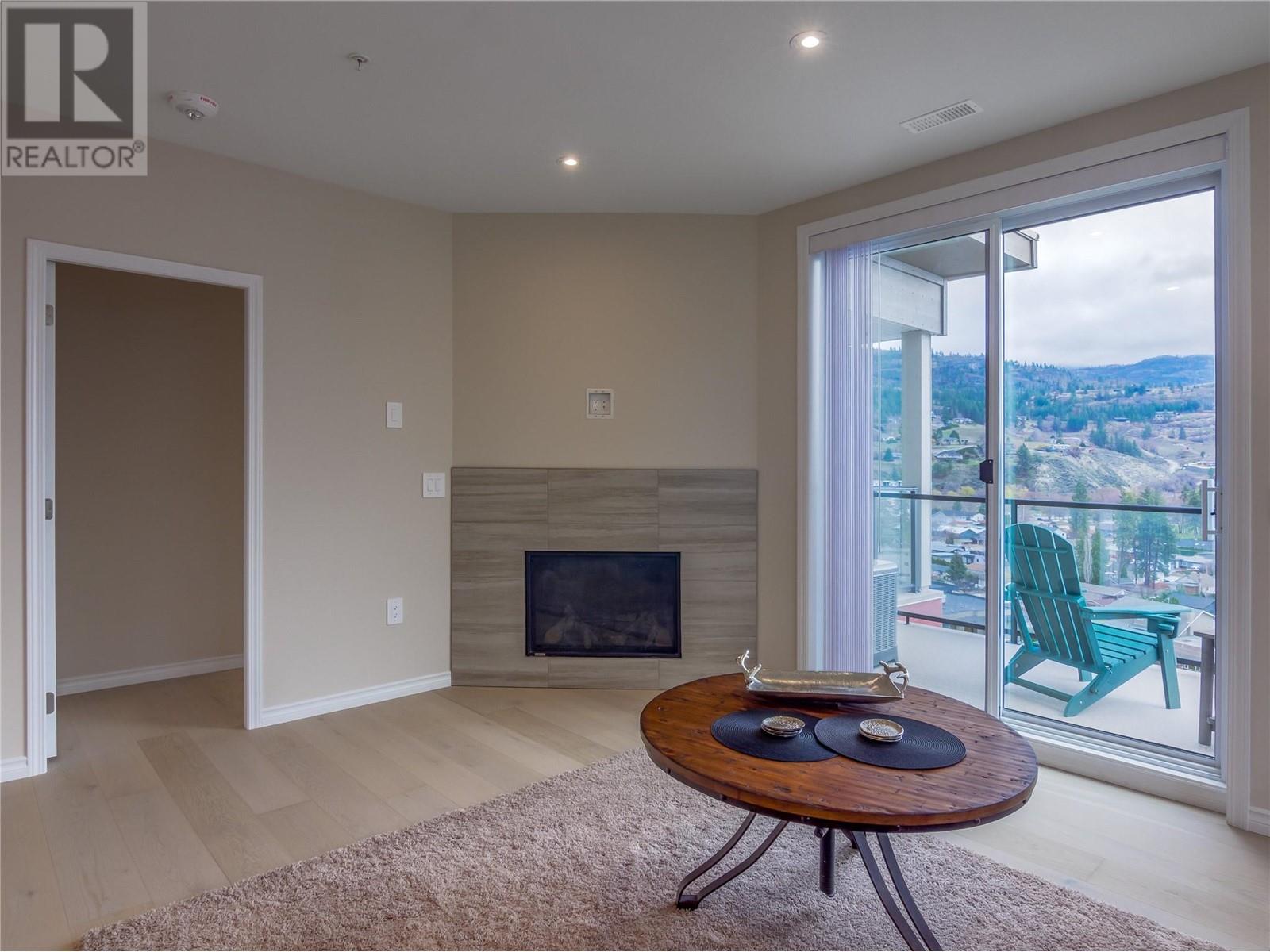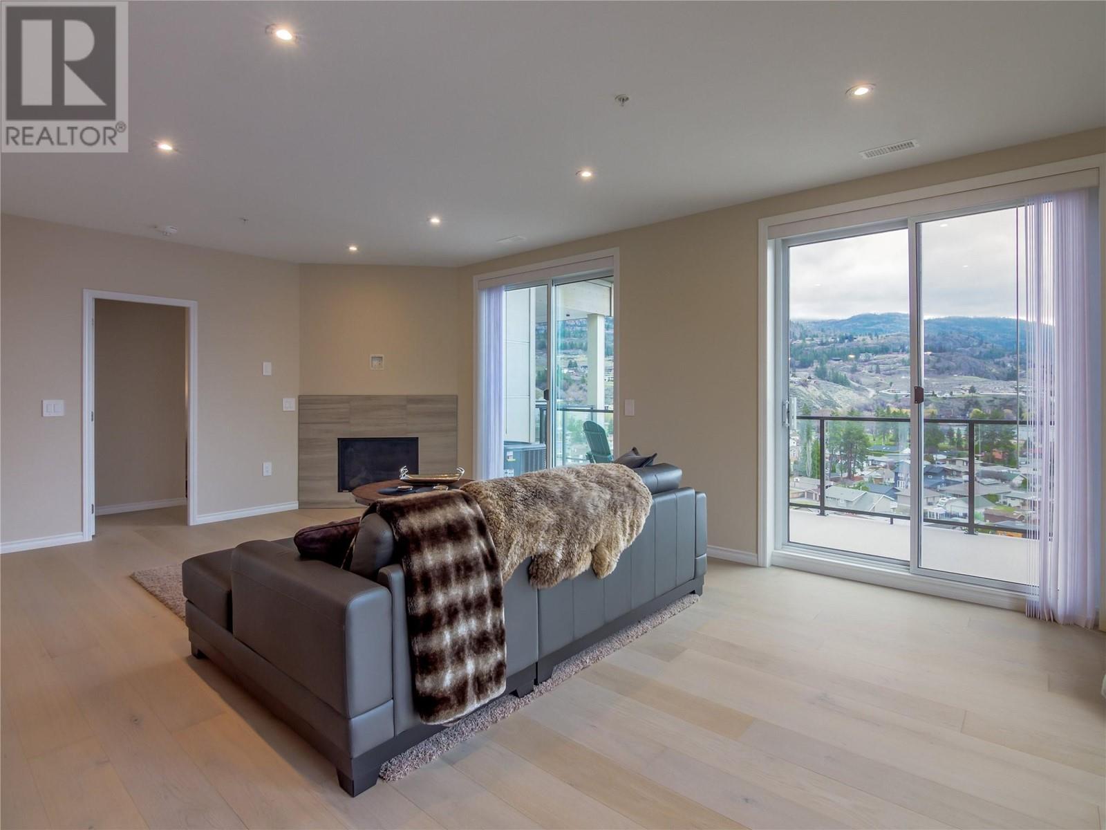 One of Skaha Lake Towers most prime units, a South West corner with unsurpassed lake views in Phase 3! This upgraded & customized unit is 1379sqft with 2 bedrooms 2 bathrooms + a den, with 2 gorgeous decks to enjoy the views from. The expansive open great room features engineered hardwood throughout, 2 sets of patio doors out to the huge South facing deck, a feature gas fireplace with modern tile, 9’ ceilings & a layout that offers great flexible options for furniture. This upgraded kitchen has sleek wood cabinets to the ceiling, is an extended size adding more cabinets & a built in microwave, has expansive counter space with a stunning huge peninsula to entertain at, quartz counters, & stainless steel appliances top it off. The customisations continue in the primary bathroom with a custom tile shower, hardwood floors run throughout all the rooms including the spacious guest bedroom & the dedicated den/home office. The primary bedroom enjoys its own deck, ensuite with double sinks & a walk in closet. This energy efficient unit has a gas hot water on demand unit, forced air heat & central AC. The suite has a storage unit on the same floor, a secure parkade parking spot, + the building has a dedicated bike locker room, common rec room & patio, & more. Enjoy living a short stroll to Skaha Lake with its gorgeous beach, parks, & walking paths. Plus enjoy conveniences nearby like Kojo sushi, the bakery and pizza shop, spinco, the Dragon Boat pub and more. This one is a must see! (id:2469)