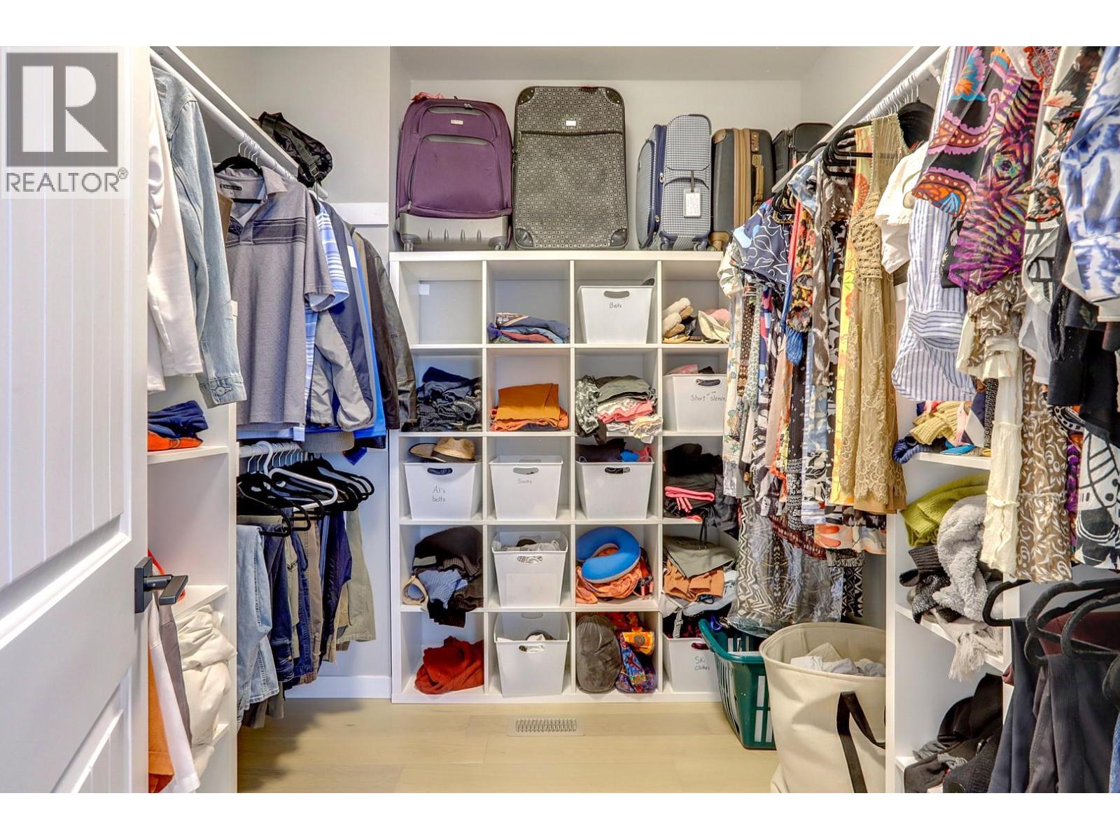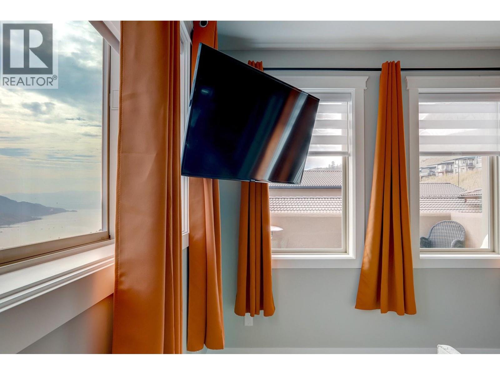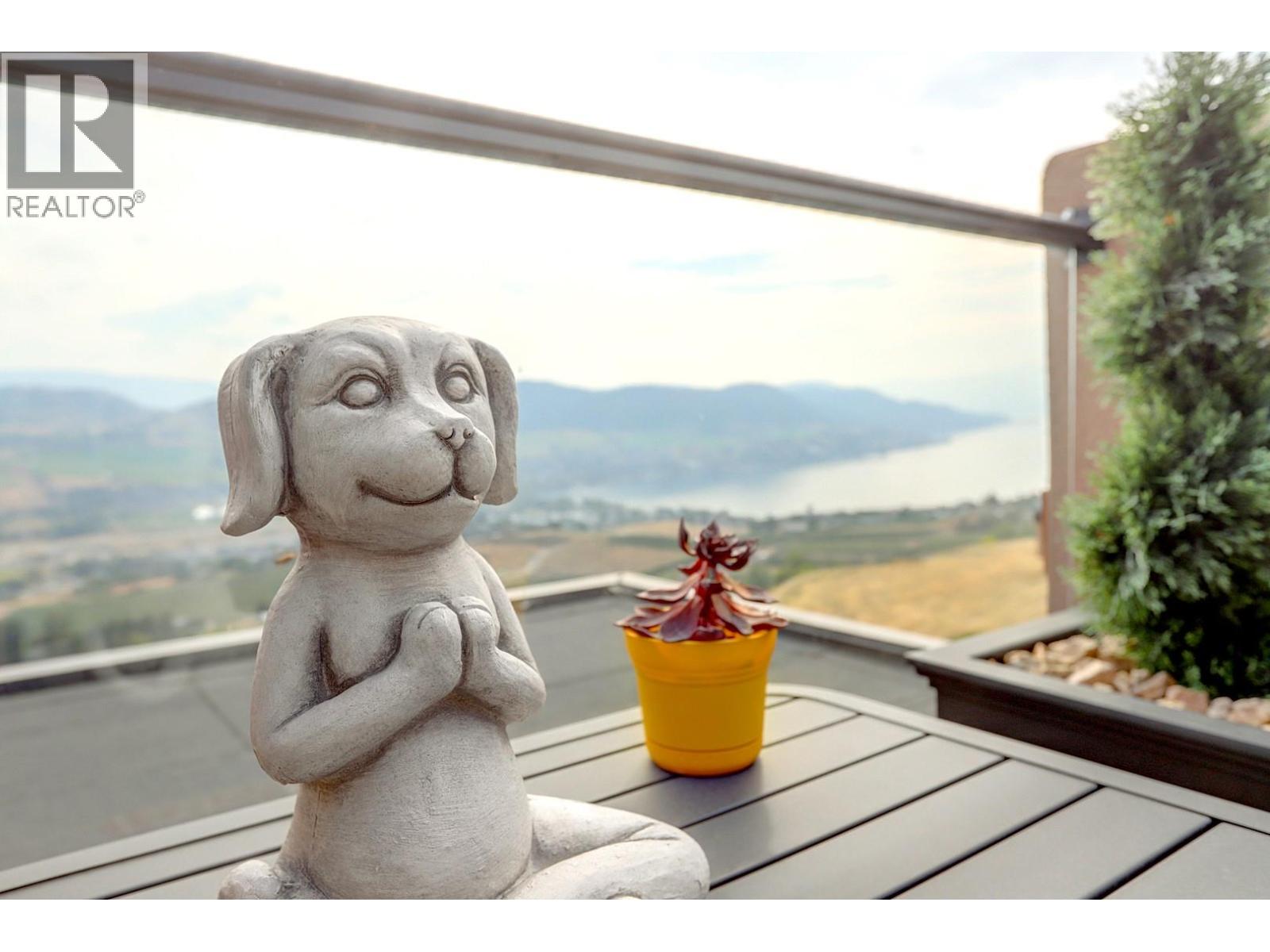 Designed for everyday living and entertaining, featuring a chef’s kitchen with an oversized island, bar-style seating, and upgraded appliances. The open-concept living and dining areas flow seamlessly to a spacious covered patio for enjoying the sweeping city and lake views. A striking Venetian plaster fireplace (electric) and exposed beams in the living room elevate the space with a warm charm. Upstairs, the primary suite occupies the second level, offering a generous walk-in closet and a luxurious 5-piece ensuite with a large upgraded soaker tub with side-mounted taps and a separate glass-enclosed shower. The private rooftop patio provides private oasis with more spectacular lake views. Thoughtful upgrades include: all lighting updated, faucets and fixtures upgraded to matte black. Trim moldings now frame all windows and doors and upgraded tiling enriches the kitchen, bathrooms, and laundry room. A quick hot-water system, upsized tank, and fully finished media/playroom downstairs add to the home’s comfort and livability. Outdoor living has been equally enhanced with, new fencing and stairs along the side of the home, faux grass and a vegetable garden with planters. The hot tub offers the perfect place to relax after a day of enjoying nearby trails or golfing at The Rise — a Fred Couples Signature Course or dinner at The EDGE Restaurant & Bar just minutes away. 2 Pets, no height or breed restrictions. (id:2469)