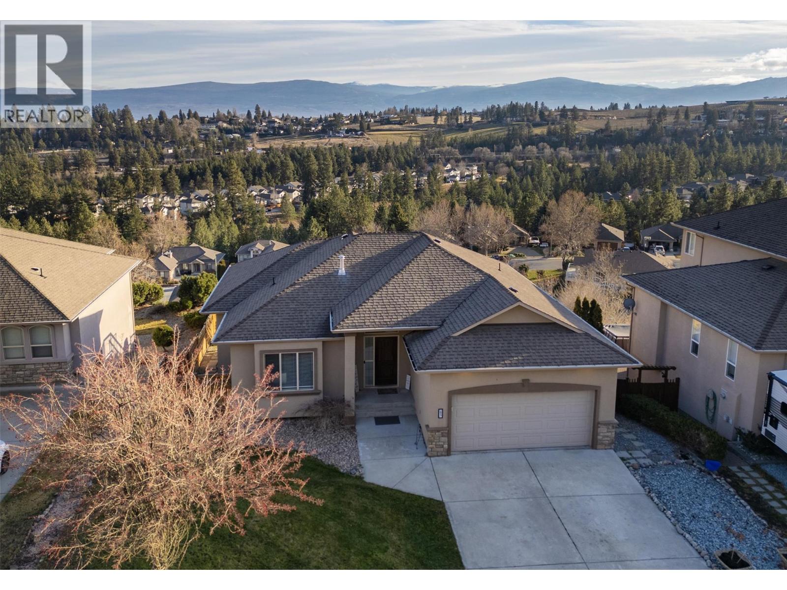 Welcome to 2053 Spyglass Way, a beautiful rancher with a walk-out basement, perfectly positioned to capture stunning valley and mountain views. This well-maintained home offers a bright, open-concept layout with vaulted ceilings, seamlessly connecting the kitchen and living room—ideal for everyday living and entertaining. The kitchen features granite countertops, Black stainless steel appliances, a Bosch dishwasher, and newer appliances, along with a water softener and filtration system. Hardwood flooring flows throughout the kitchen and living area, complemented by a cozy gas fireplace. Step outside to enjoy the all-new vinyl deck installed in 2022, complete with stairs providing easy access to the backyard—perfect for relaxing or hosting guests. The walk-out basement offers excellent flexibility, featuring a full bar with a striking stone feature wall and ample storage, or it could easily function as a suite for a parent or older child. Additional highlights include a flat driveway, quiet location, serviced A/C in 2025, and great storage space downstairs. Conveniently located close to amenities, transit, and just a 7-minute drive to Kelowna, this home offers comfort, functionality, and an exceptional lifestyle. (id:2469)