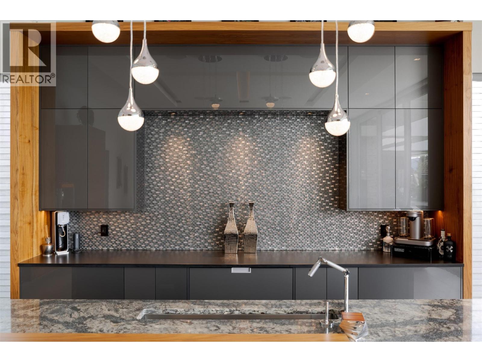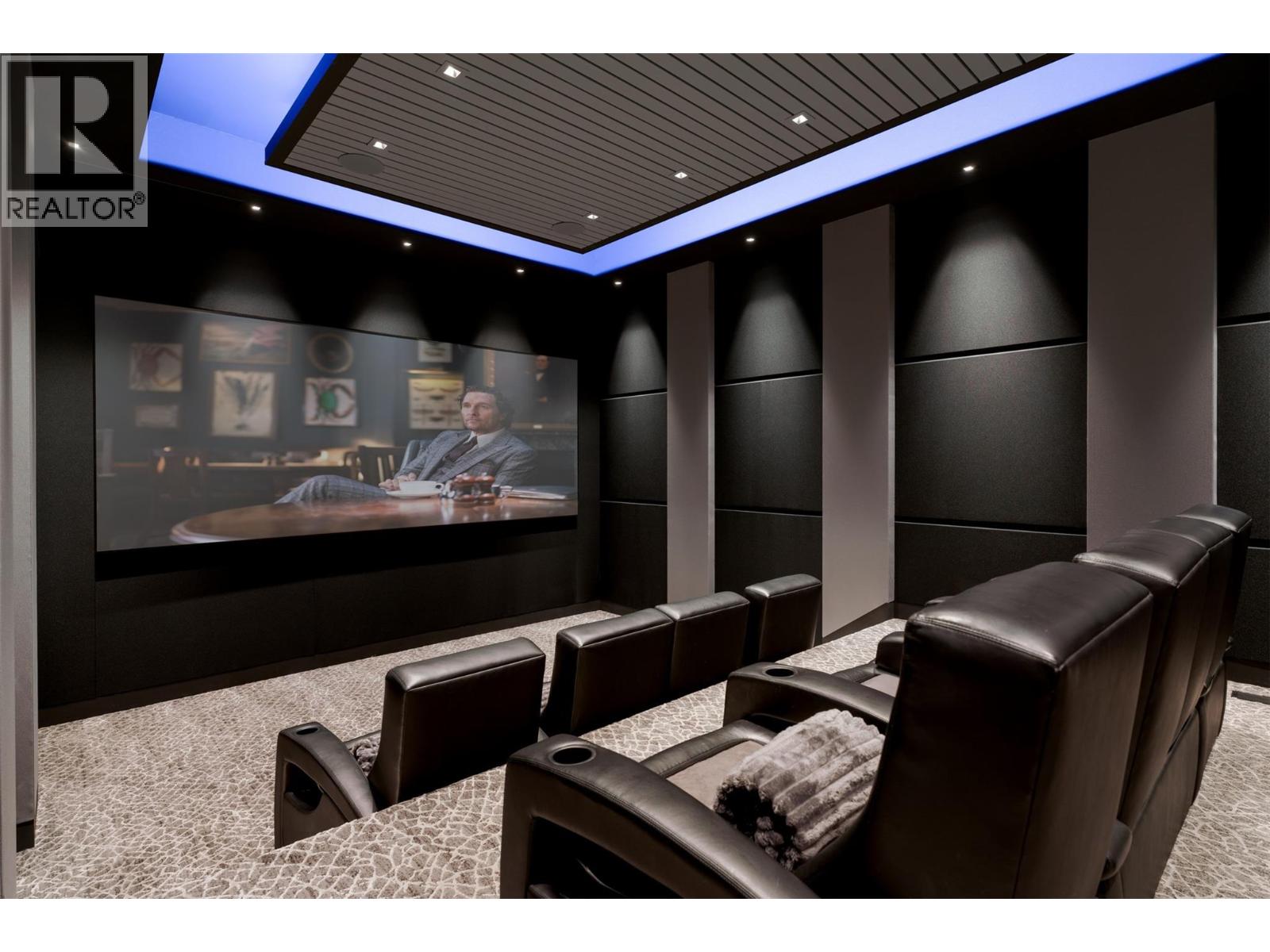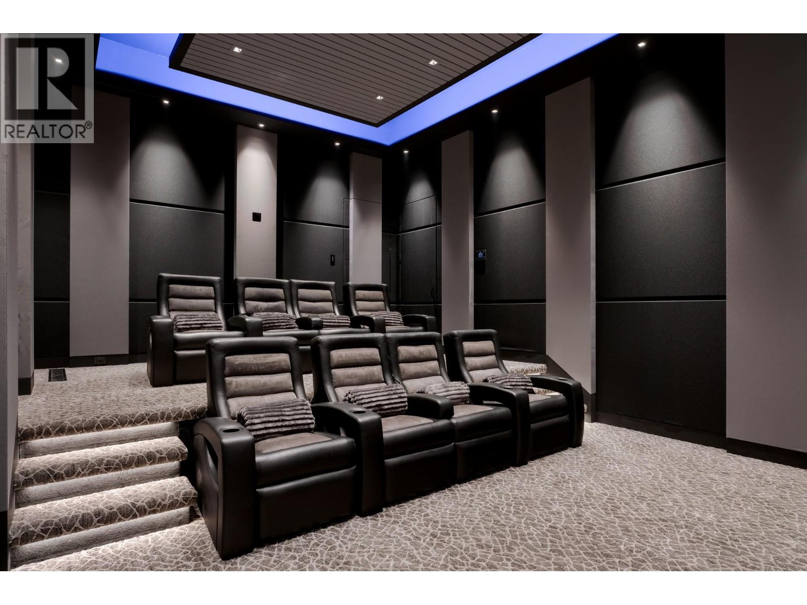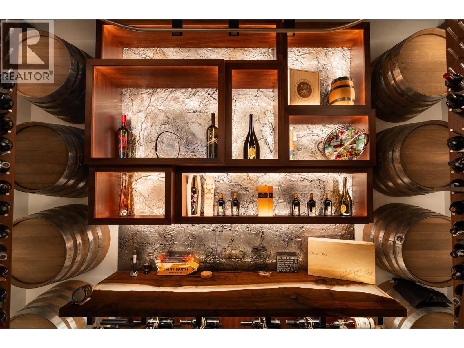 Discover unparalleled luxury at this magnificent custom Okanagan home. As you pass through the gate, you'll immediately be captivated by its design. The modern aesthetic seamlessly integrates the home with its landscaping, creating a harmonious experience. The entry features a mesmerizing floating roof design inspired by a museum in Spain, and light filled courtyard to display custom artwork Inside, entertain at the custom bar, enjoy a cinematic experience in the state-of-the-art home theatre, and store your prized vintages in the 1,500-bottle wine room. For seamless indoor to outdoor living all the sliding doors open to a completely private backyard offering a sensational living experience: prepare a culinary feast in the outdoor kitchen, lounge by the expansive saltwater vanishing edge pool, or soak in the hot tub, all while enjoying the relaxing ambiance of the waterfall and 180-degree views of Okanagan Lake. Take the floating walnut staircase or the elevator upstairs. The primary bedroom is a retreat like no other, with a private patio, luxurious lake view en suite, and a stunning custom closet. Three additional bedrooms each have their own en suite. For the car enthusiast, this home boasts 2 levels of garages with parking for 7+ vehicles. Exquisite finishes include porcelain tile floors, Cambria quartz, &unmatched glass and walnut woodwork by Shawn Truit. This custom home stands as a masterpiece of design and engineering. (id:2469)